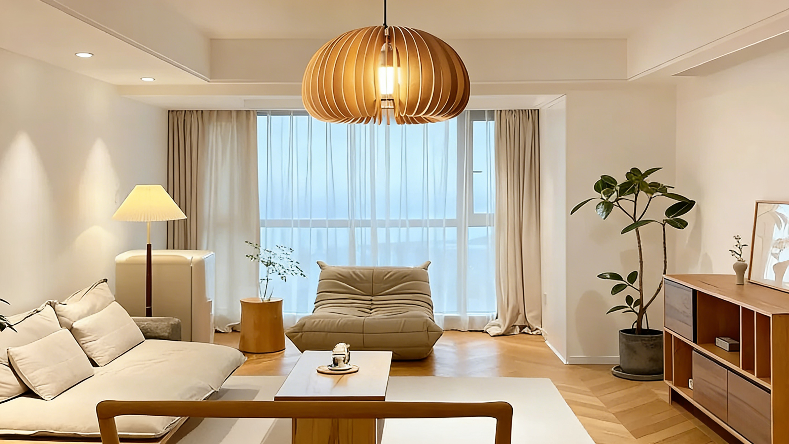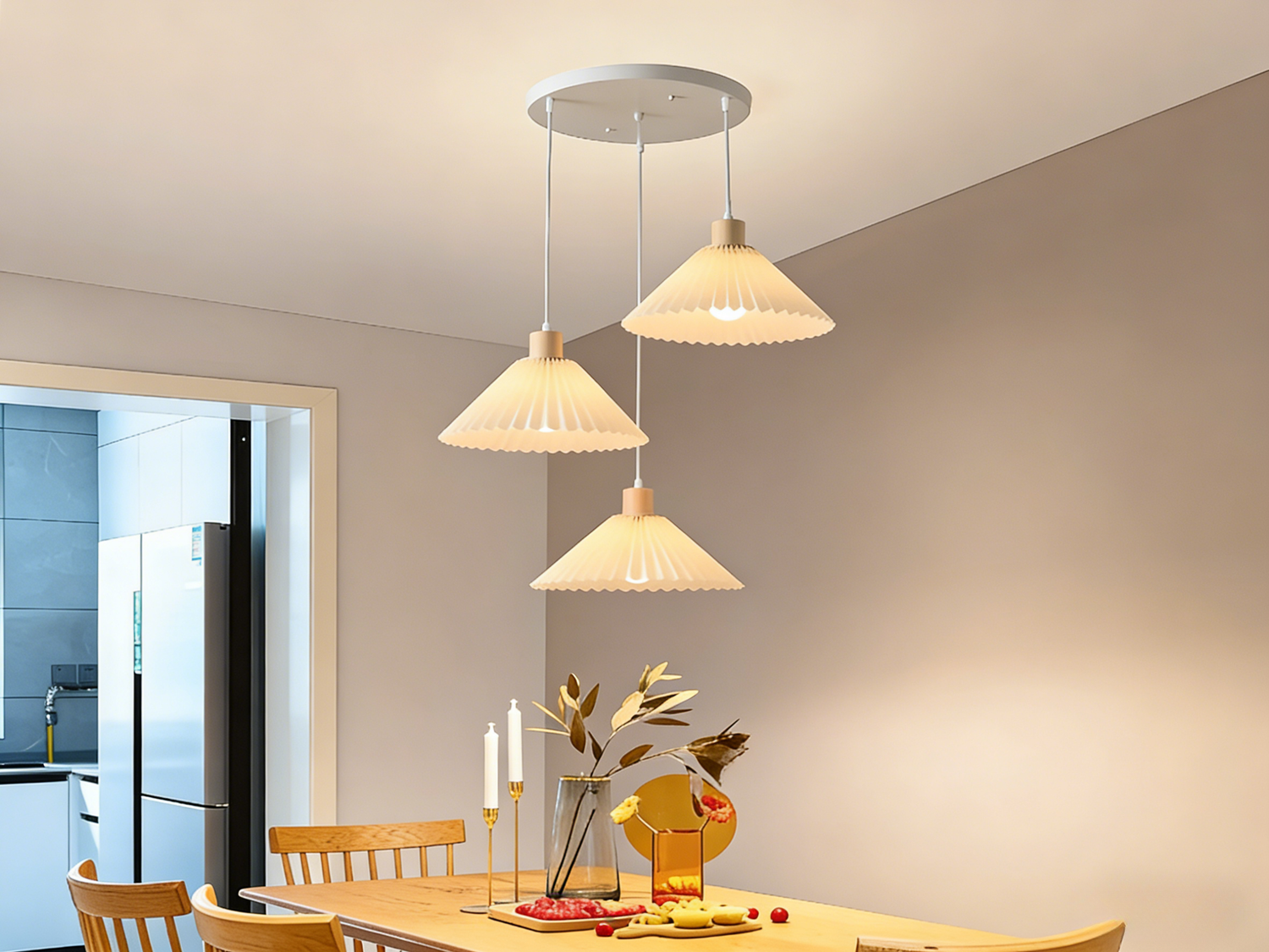 A modern pendant light featuring a softly pleated beige fabric shade. It diffuses a warm, inviting glow perfect for kitchen islands and dining areas.